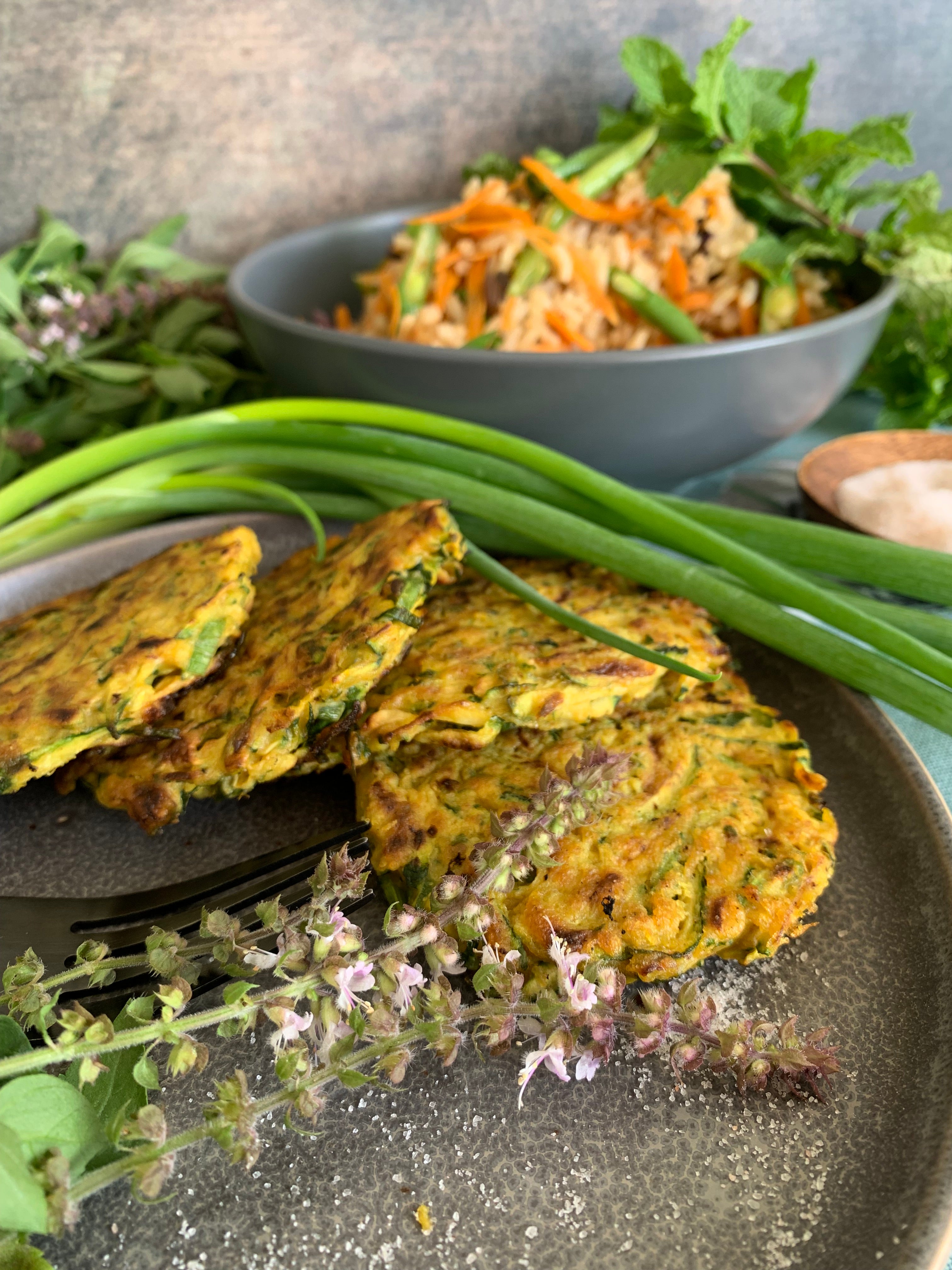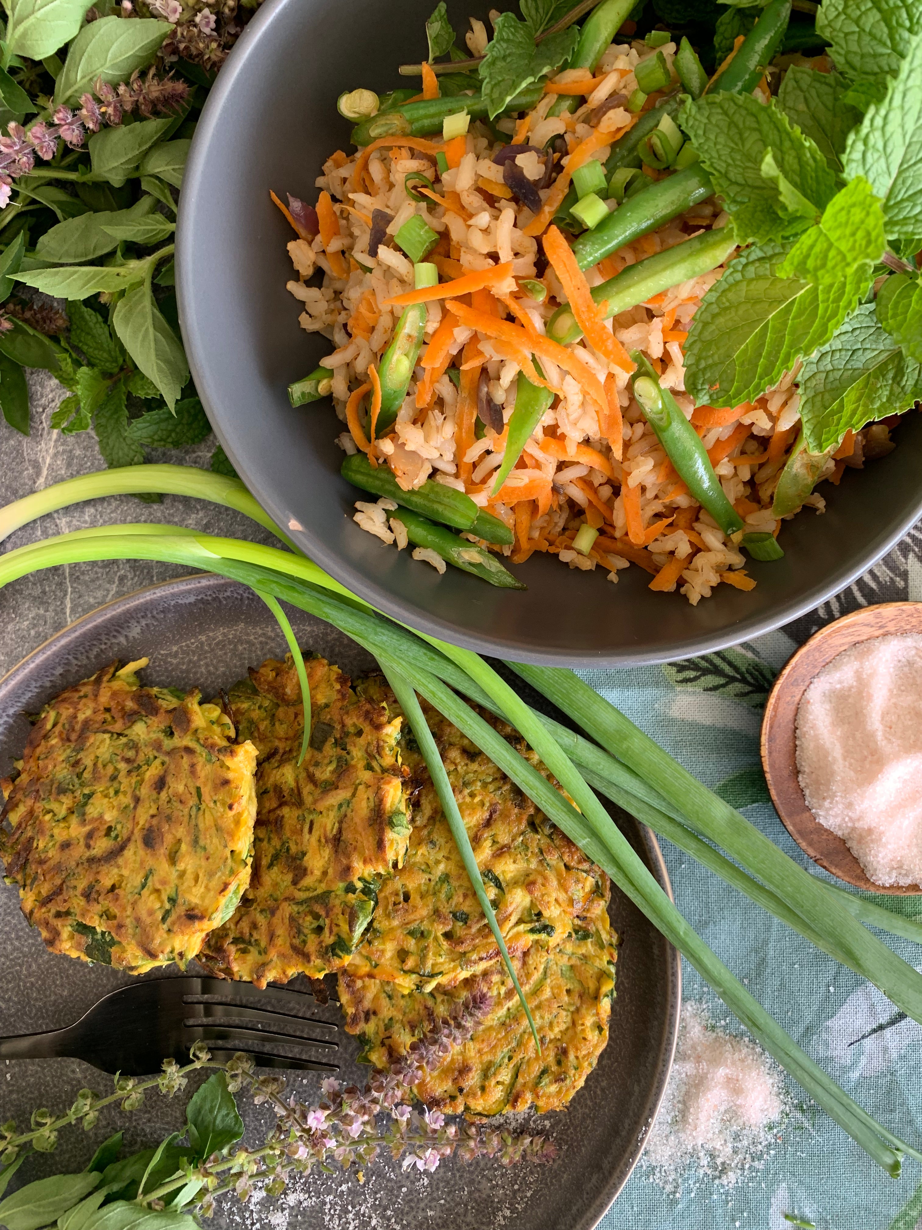 Vegan Friendly Baby marrow fritters crafted with a blend of aromatic spices. Paired with fragrant brown rice packed with stir fried carrots, onions and green beans. Drizzled with a peanut ginger dressing perfectly balanced with the nutty richness of peanuts and the subtle heat of ginger.